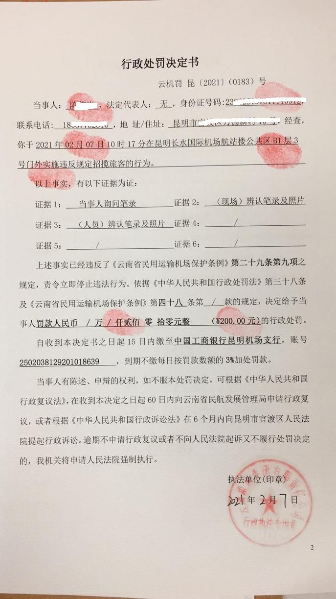 行政处罚决定书 云机罚 昆{2021} (0184)号