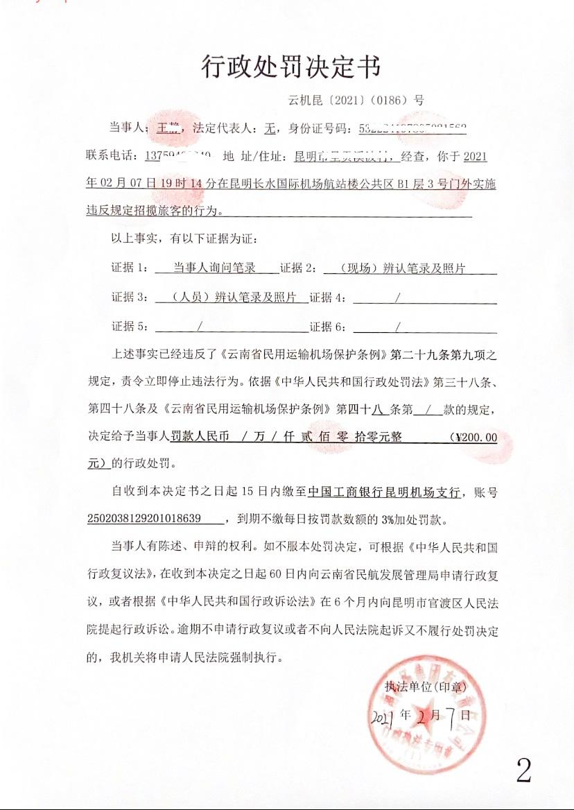 行政处罚决定书 云机罚 昆{2021} (0186)号