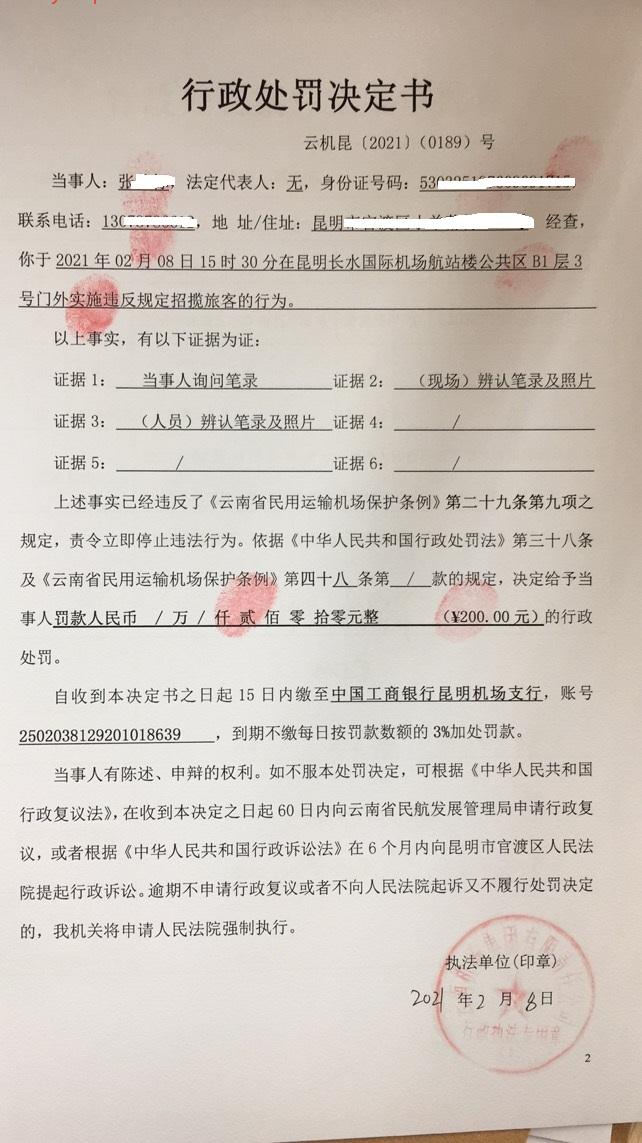 行政处罚决定书 云机罚 昆{2021} (0190)号