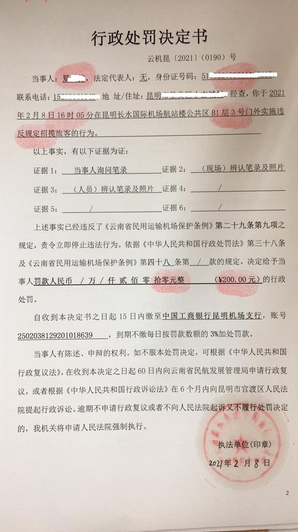 行政处罚决定书 云机罚 昆{2021} (0190)号