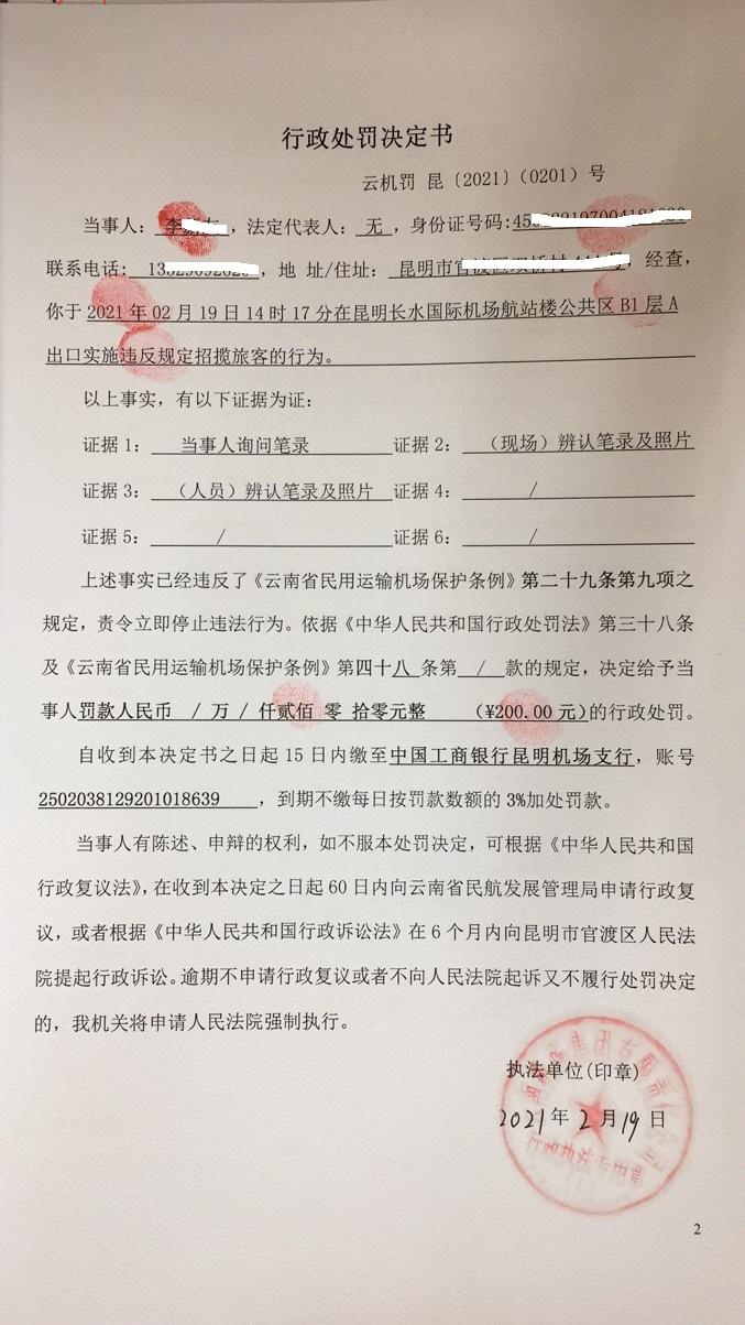 行政处罚决定书 云机罚 昆{2021} (0200)号