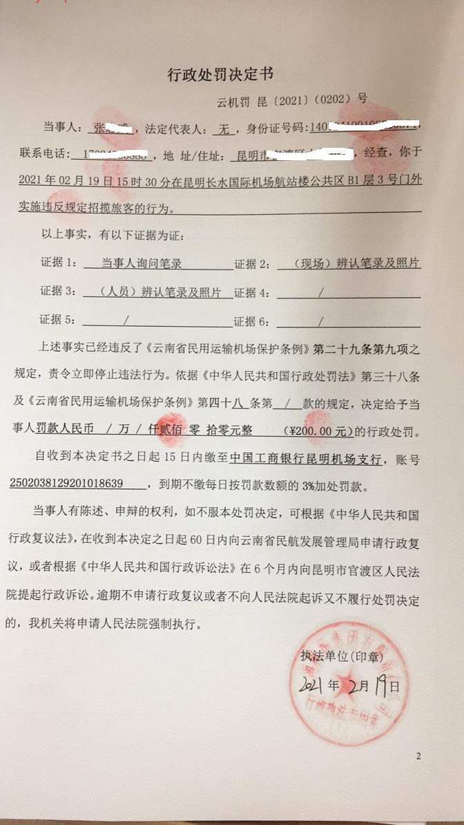 行政处罚决定书 云机罚 昆{2021} (0202)号