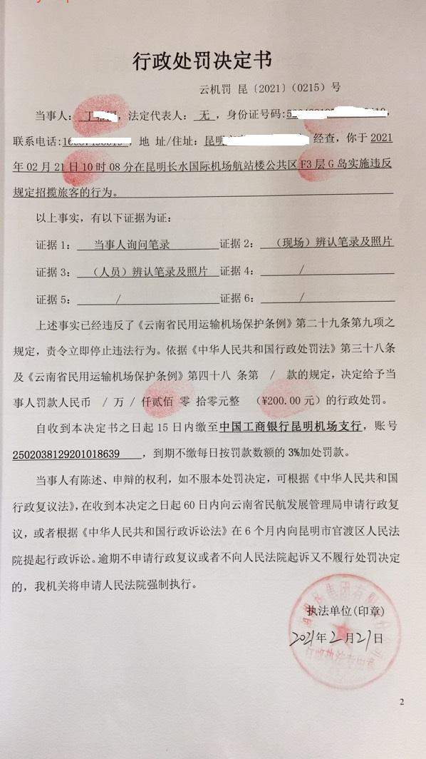 行政处罚决定书 云机罚 昆{2021} (0216)号