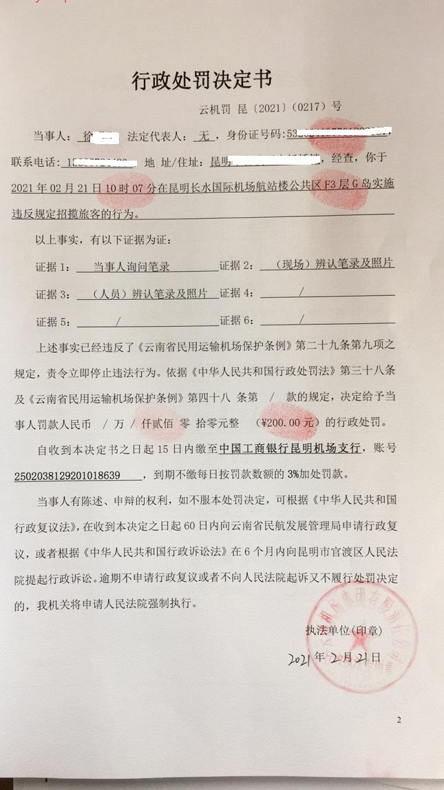 行政处罚决定书 云机罚 昆{2021} (0218)号
