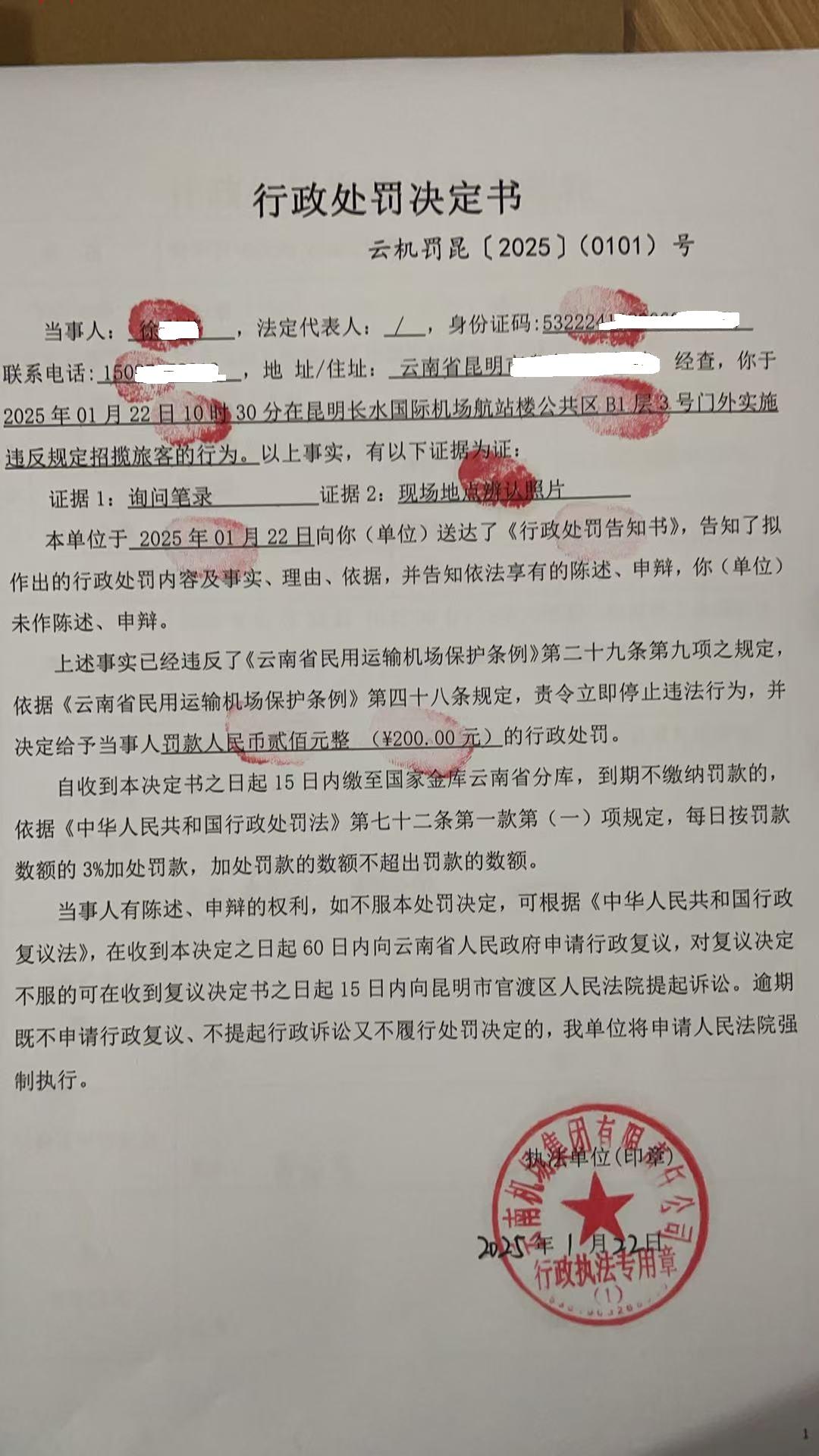 行政处罚决定书 云机罚 昆{2025} (0101)号