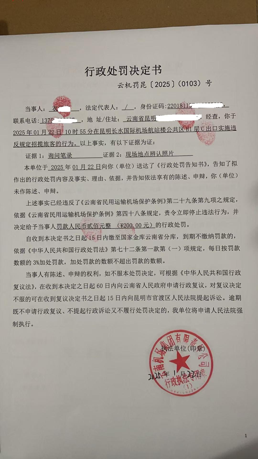 行政处罚决定书 云机罚 昆{2025} (0103)号