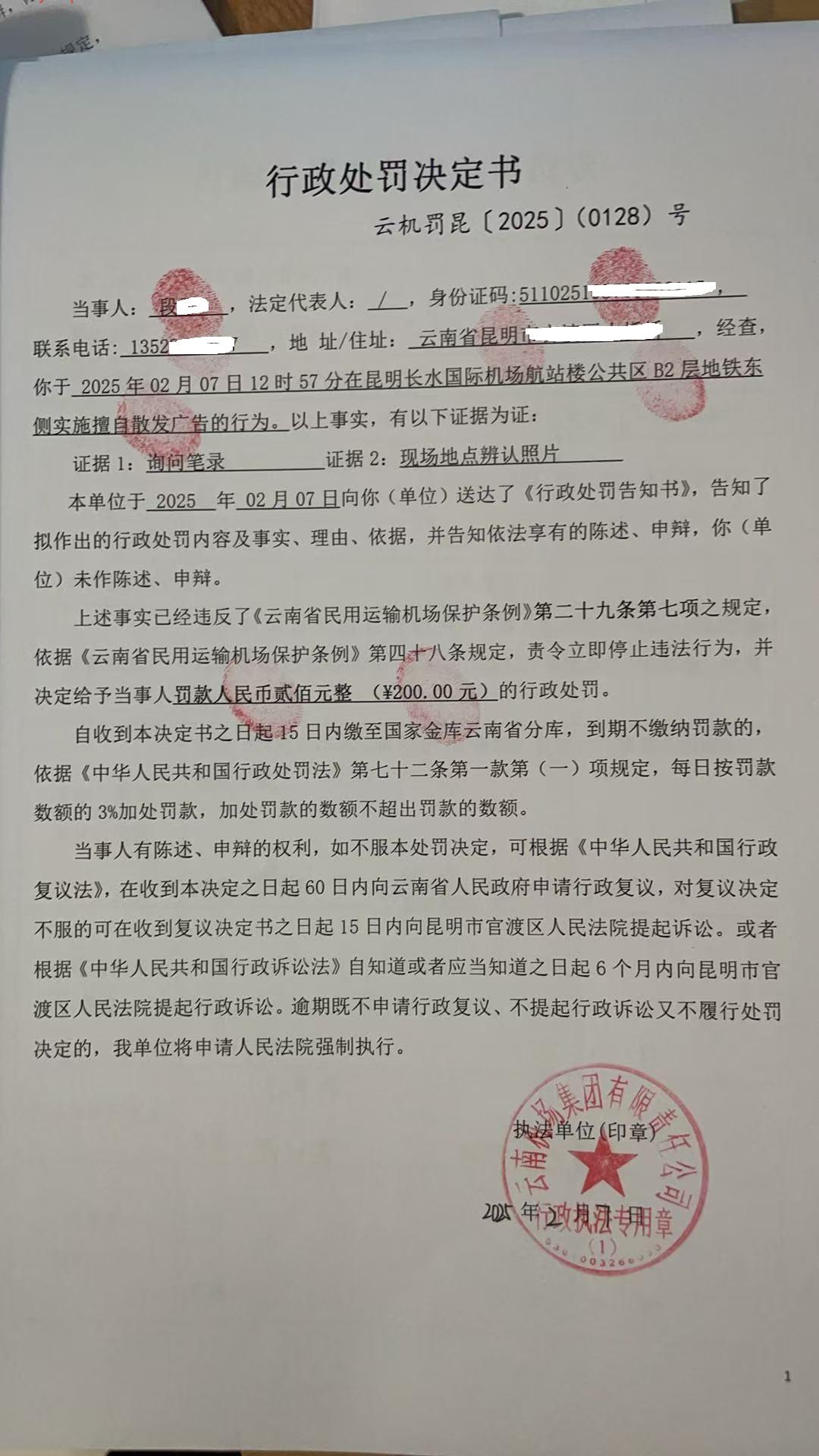 行政处罚决定书 云机罚 昆{2025} (0127)号