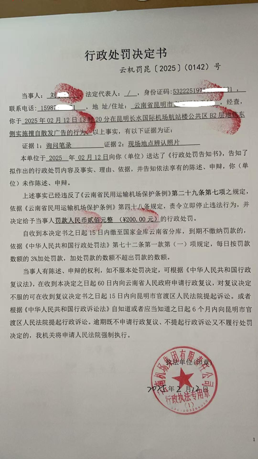 行政处罚决定书 云机罚 昆{2025} (0142)号