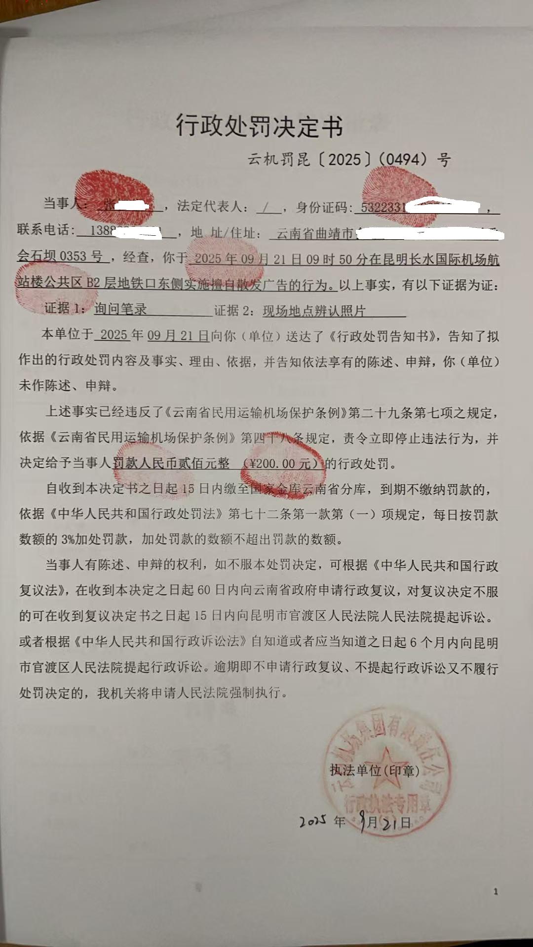 行政处罚决定书 云机罚 昆{2025} (0494)号