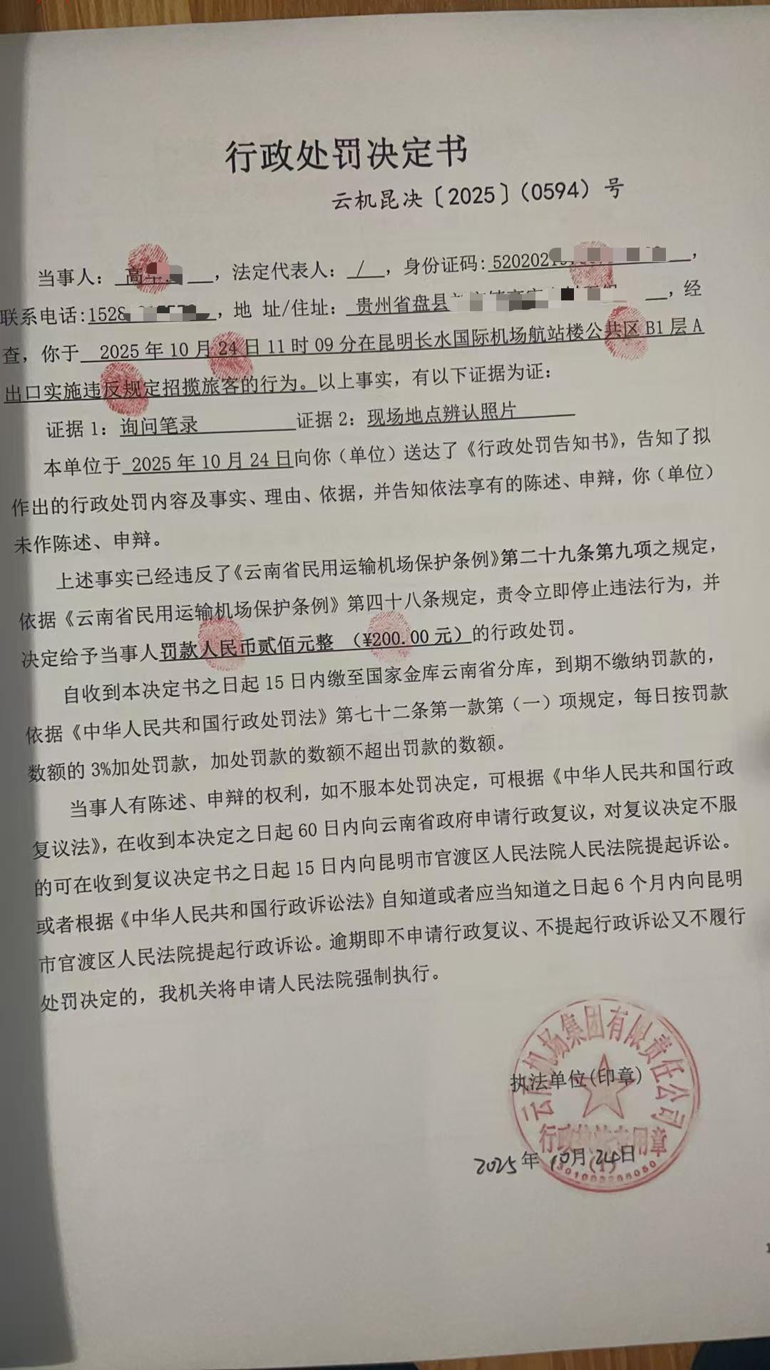 行政处罚决定书 云机昆决{2025} (0595)号