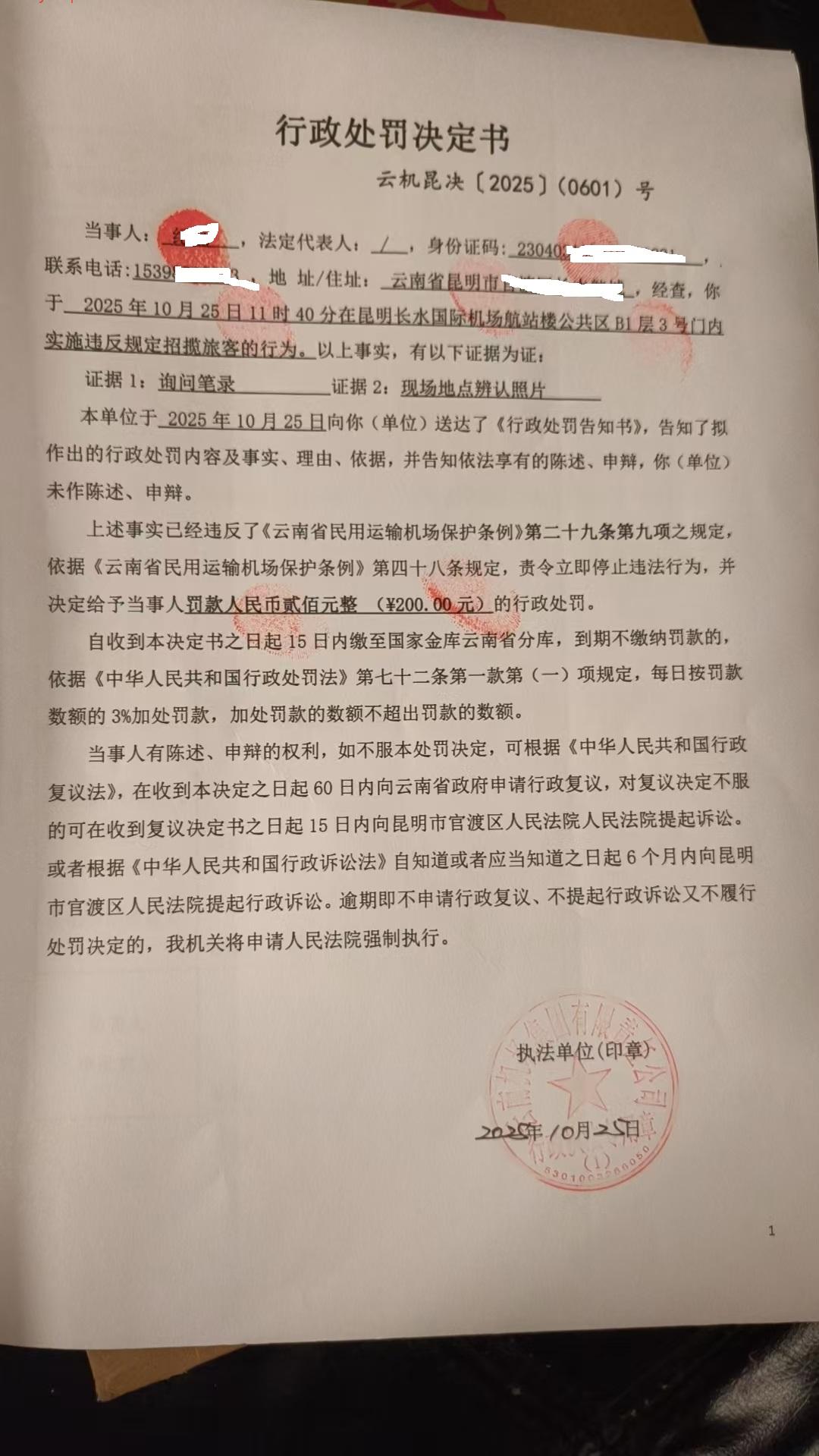 行政处罚决定书 云机昆决{2025} (0600)号