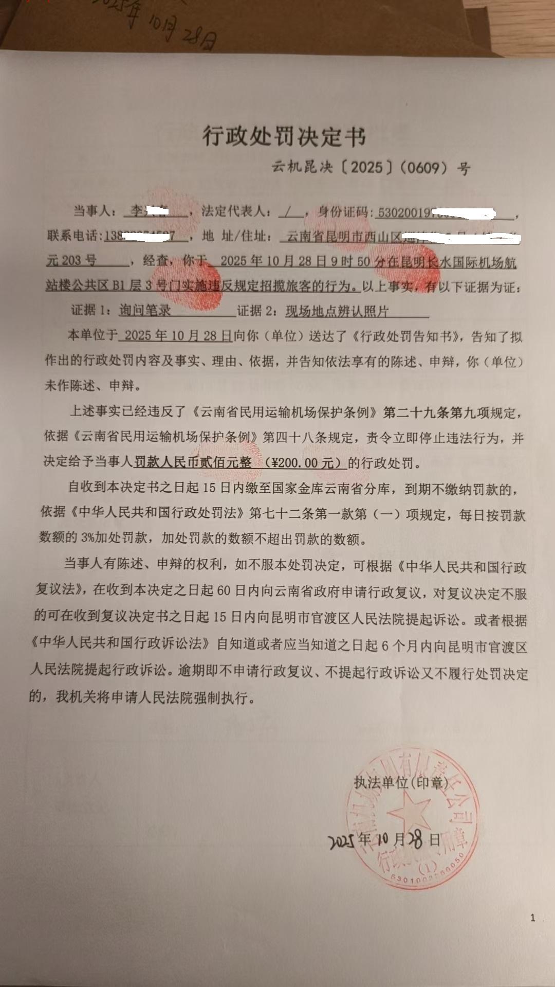 行政处罚决定书 云机昆决{2025} (0610)号