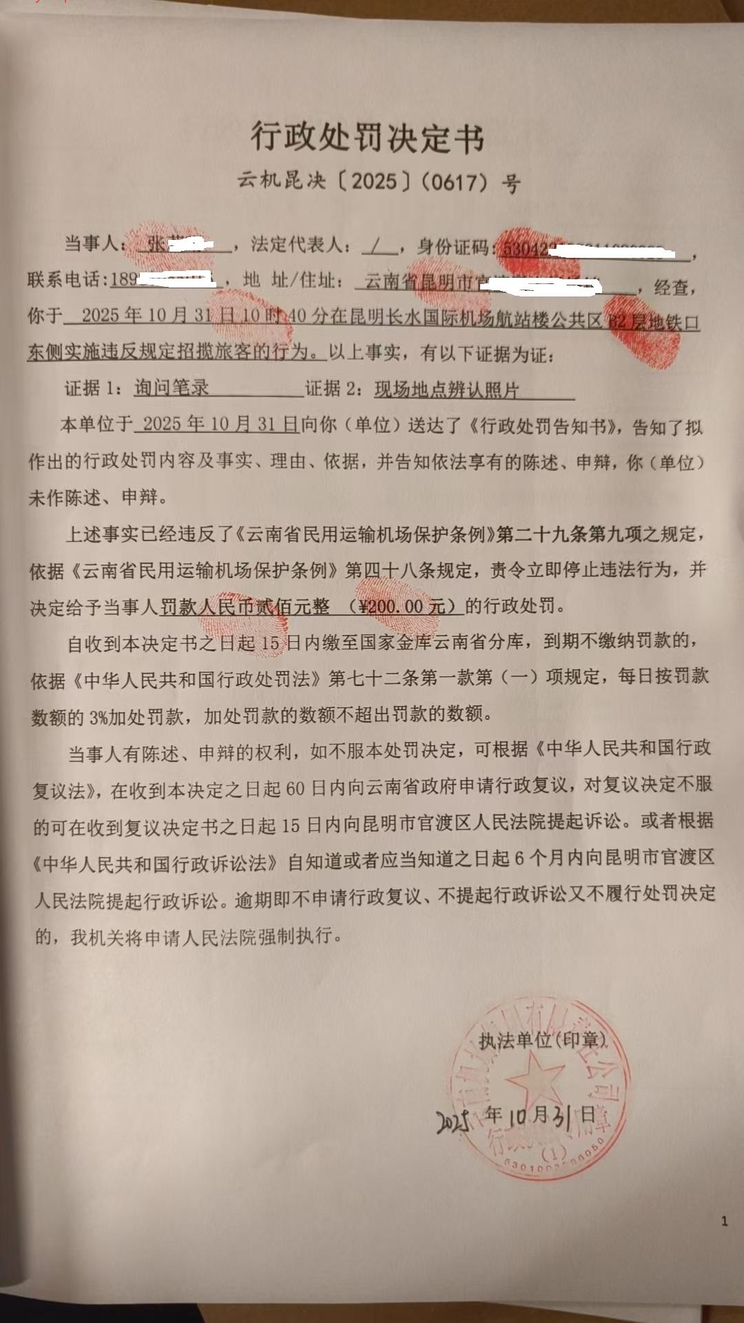 行政处罚决定书 云机昆决{2025} (0617)号