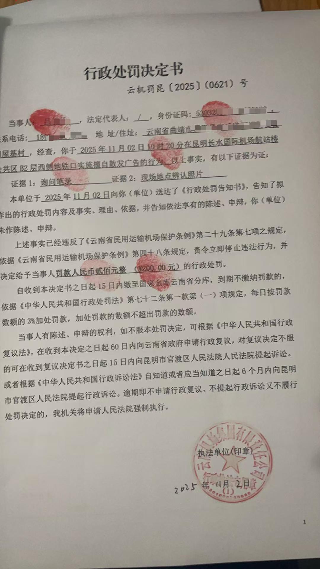 行政处罚决定书 云机罚 昆{2025} (0621)号