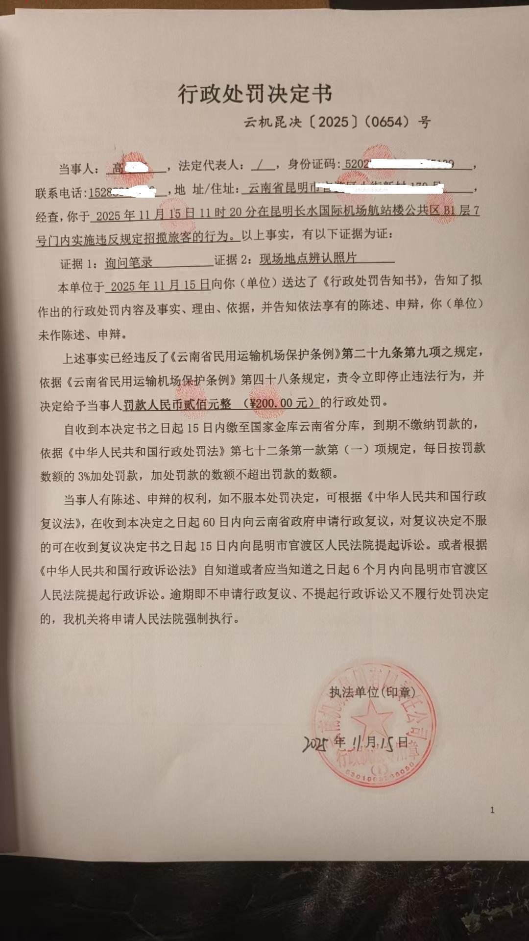 行政处罚决定书 云机昆决{2025} (0655)号