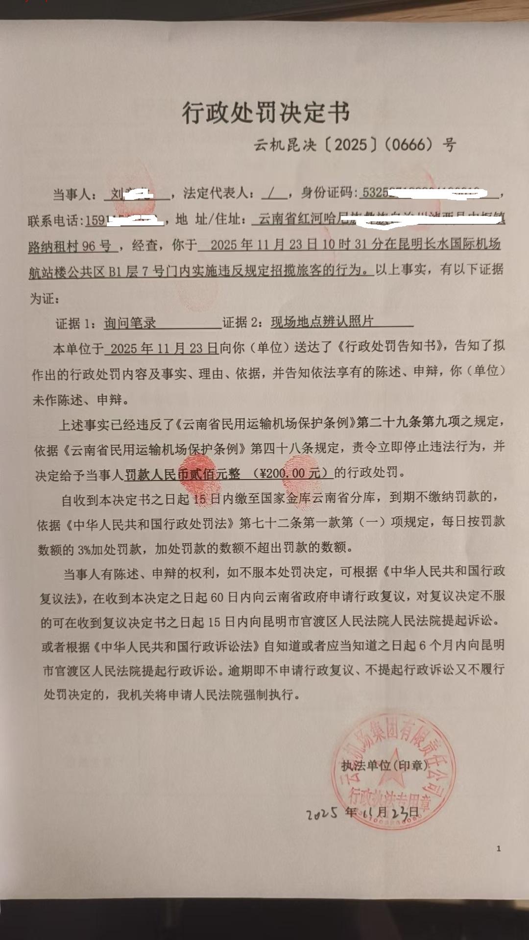 行政处罚决定书 云机昆决{2025} (0666)号