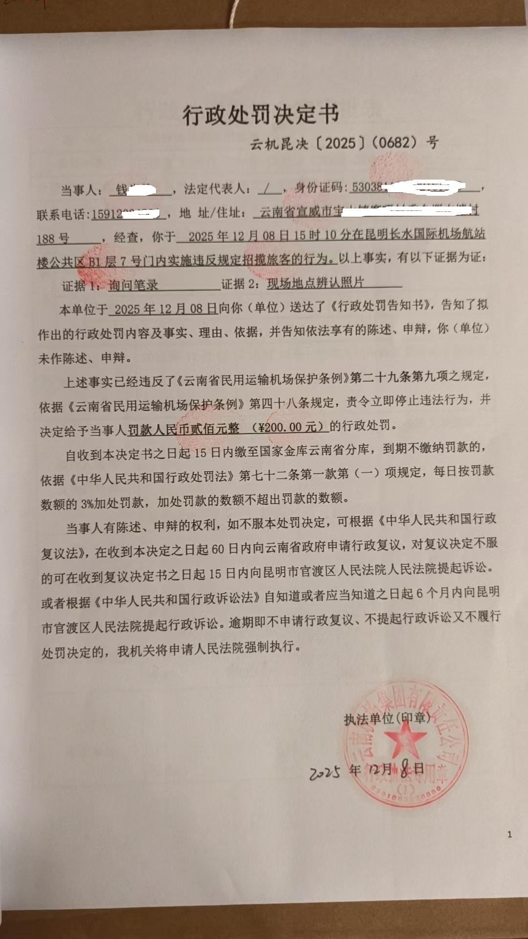 行政处罚决定书 云机昆决{2025} (0682)号