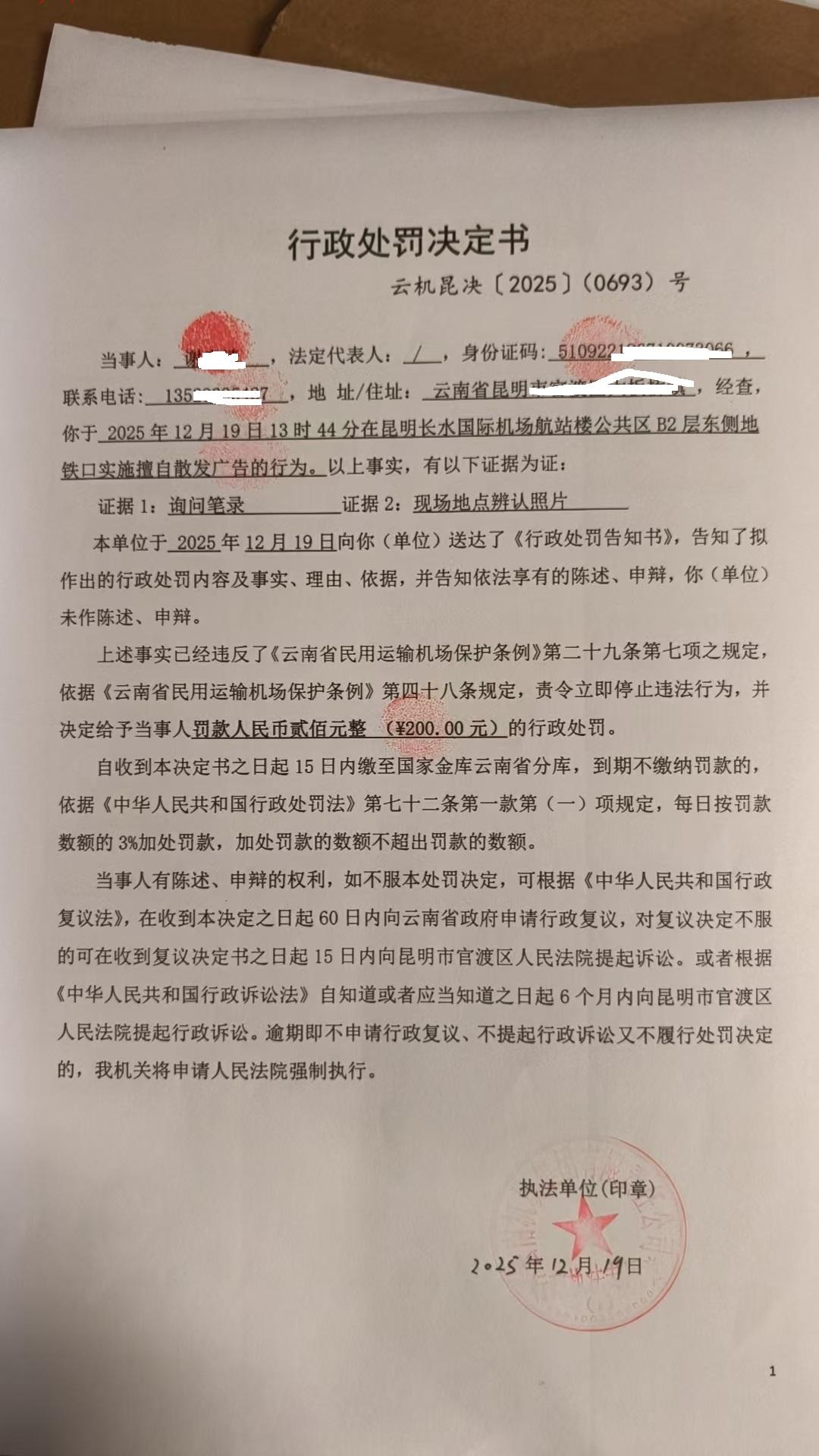 行政处罚决定书 云机罚 昆{2025} (0694)号