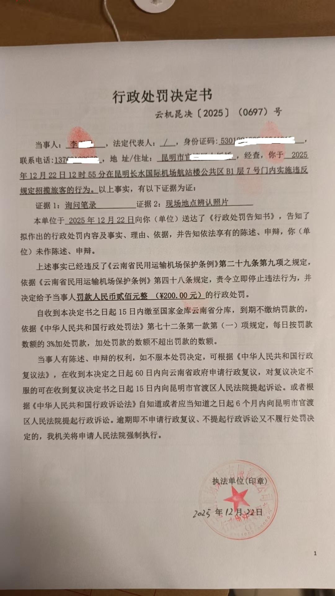 行政处罚决定书 云机昆决{2025} (0698)号