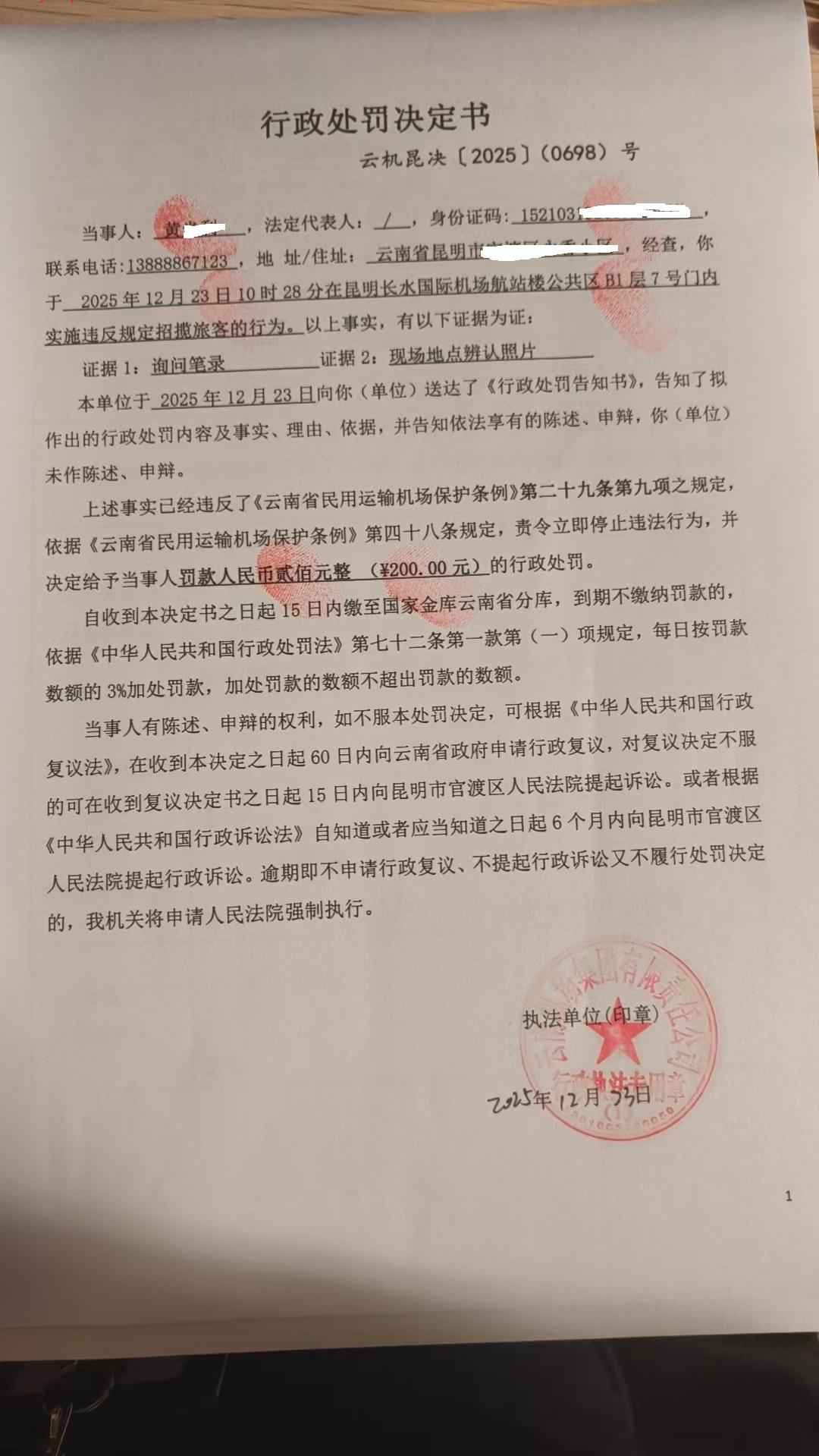 行政处罚决定书 云机昆决{2025} (0698)号